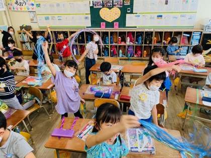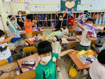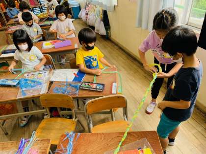 スズランテープをねじったり、細かくさいたり、色を混ぜて編んだり、様々な工夫をしながら、楽しそうにゆれ方を試していました。