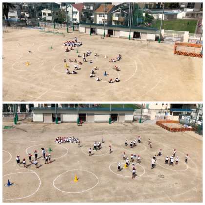 【2年生】運動場で体育 芝生では園児がかけっこ!