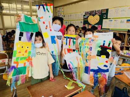 色紙で丁寧に飾りを作り、3色のテープを編み込んでいる児童もいます。