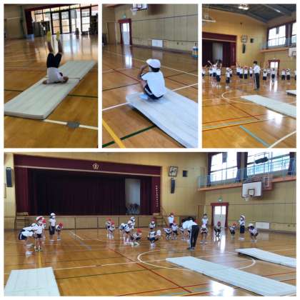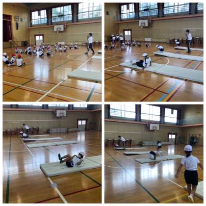 9月24日(金)1時間目、体育館でマット運動に取り組んでいます。