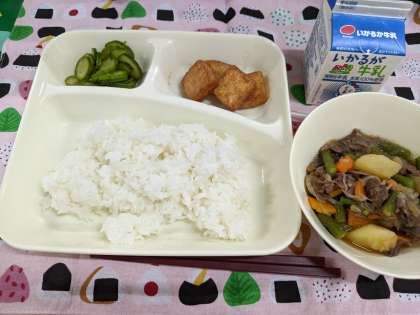 9月24日(金)のこんだては「肉じゃが、あつあげのみそだれかけ、あっさりきゅうり、ごはん、牛乳」です。