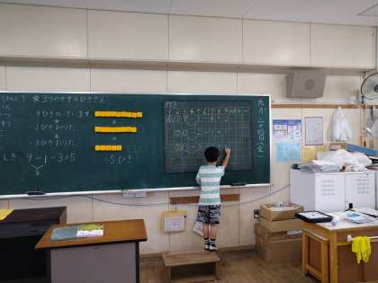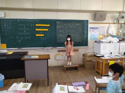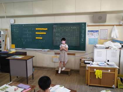 黒板に答えを書き、その答えをみんなに聞こえやすい声でしっかりと言うことができました!