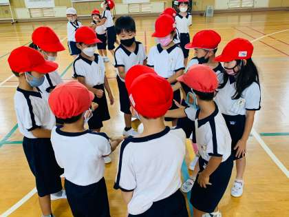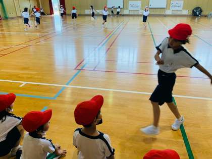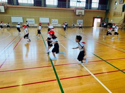赤組と白組のおに2名ずつが、それぞれ相手の組の児童をどんどんタッチしていきます。