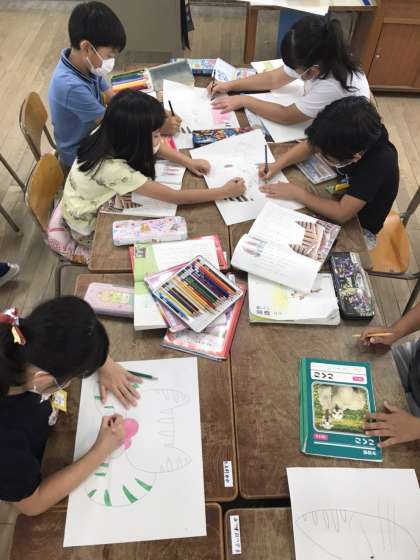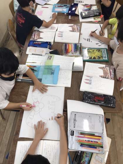 ニャーゴを音読劇の形で発表するために、練習しました。タマの顔をじぶんたちで考え、色を塗っています。最後に読み方に注意しながら音読をしました。発表が楽しみです。
