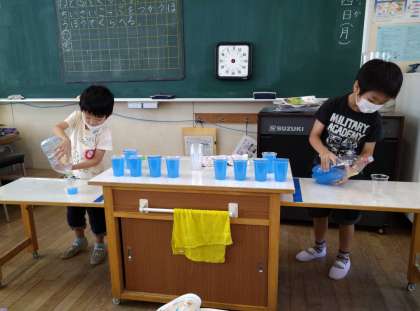 コップいくつ分かを予想し、子どもたちが直接コップに水を注いで比べました!