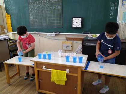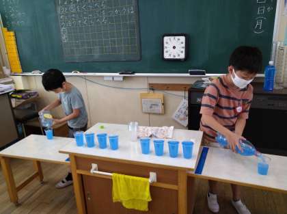 算数では、小さいコップがいくつ分かで水の量を比べるという学習をしました!