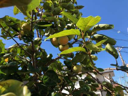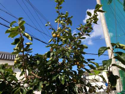 柿の葉に隠れてわかりづらいですが、柿の実が少しづつ色づき始めています。