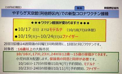 阿倍野区役所からのお知らせ(ワクチン種別の変更) 10/6