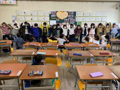 体育の時間に上手く踊れなかったところを、教室に戻ってから練習しています。