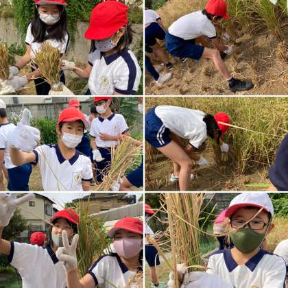次の時間が体育だったため、体操服を着て稲刈りをしました。