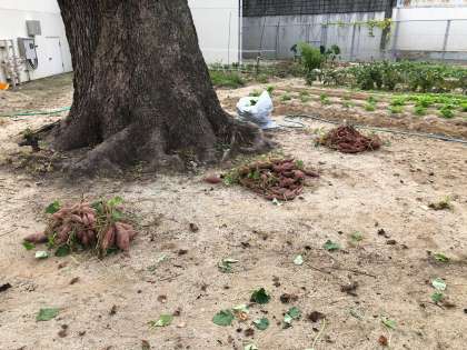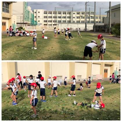 芋ほりの後は、芝生広場で芋のツルを使ってなわとびをしたりつる引きをしたり・・・