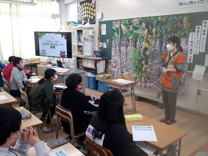 カカオがどのように収穫され、チョコレートになるのか、動画を見たりお話を聞いたりしています。