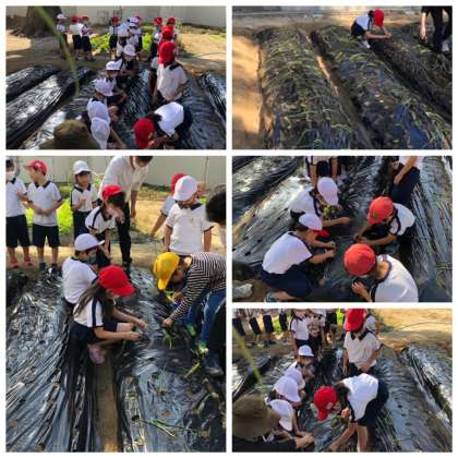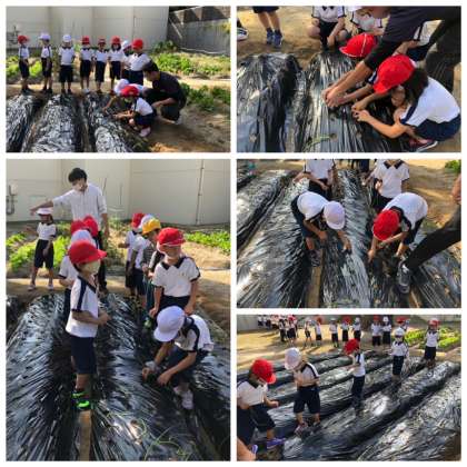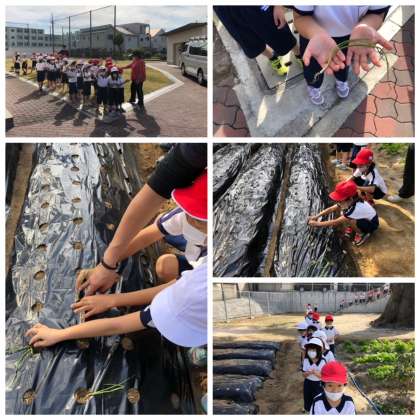 11月1日(月)運動会の全体練習をしたあと、くすのき広場の畑で、たまねぎの植え付けをしました。