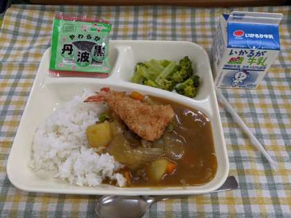 11月4日(木)のこんだては「えびフライカレーライス、ブロッコリーのサラダ、ソフト黒豆、牛乳」です。