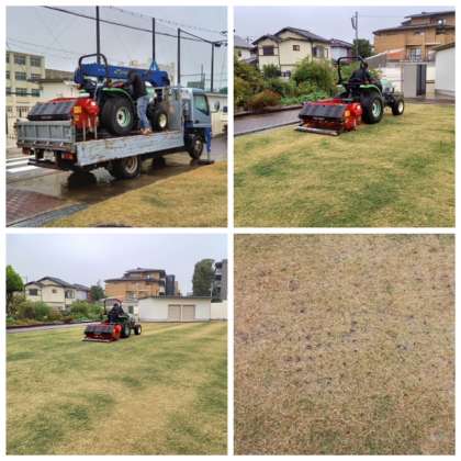 まず初めに、トラクターによるエアレーション作業、簡単に言うと芝生に穴をあけて通気性をよくする作業です。