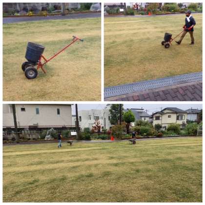 続いて、オーバーシード作業。冬でも育つ冬芝の種をまき、目土をします。