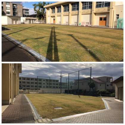 発芽して成長するまで、当分の間は立ち入り禁止になります。ご理解ご協力お願いします。冬でも青々とした芝生広場になることを楽しみにしていてください。