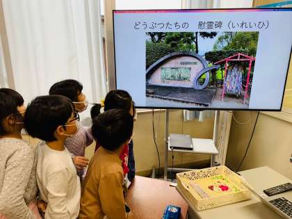 1学期の平和学習、「ライオンがいなくなった動物園」に出てきた、戦争中に人間の勝手な都合によって命を奪われたたくさんの動物達が眠る慰霊碑についても再度学びました。
