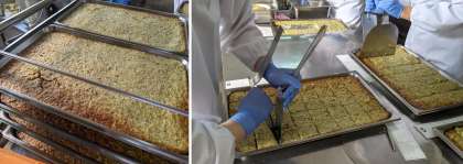 お好み焼きは、キャベツ、青ねぎ、小麦粉、卵、やまいもなどを混ぜ合わせた生地を鉄板に流し入れて焼き、切り分けて配缶します。小袋のトンカツソースをかけて食べます。