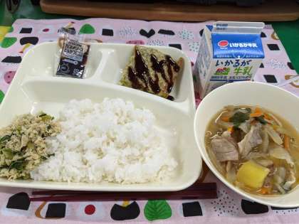 11月15日(月)のこんだては「お好み焼き、豚汁、とりなっ葉いため、ごはん、牛乳」です。
