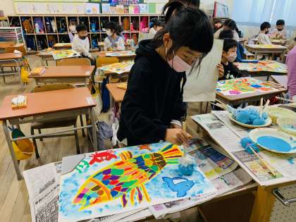 作っていただいたたんぽで、魚や花のまわりにポンポンと色をつけます。