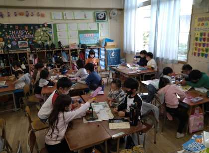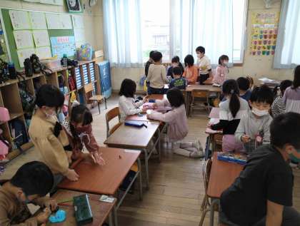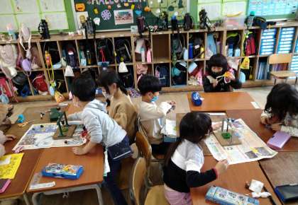 出来上がったこまに顔を描いたり、こまを友だちと交換して回してみたり、みんなとても楽しみながら学習することができました。