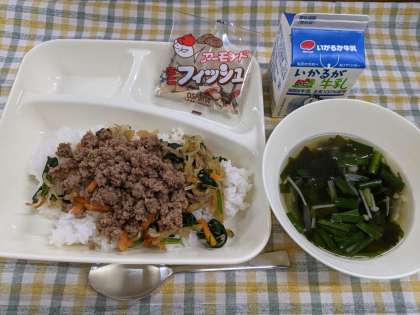 11月22日(月)のこんだては「ビビンバ、わかめスープ、アーモンドフィッシュ、牛乳」です。