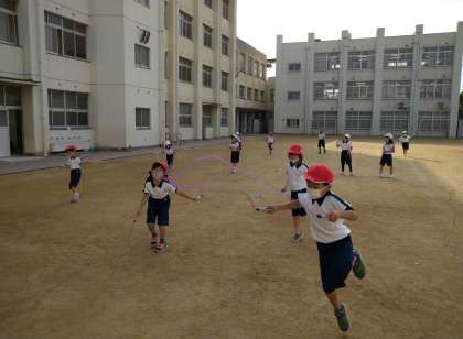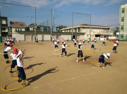 リズムジャンプの後、クラスに分かれて縄跳びやフラフープをしました。