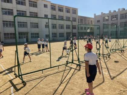 体育ではなわとびをし体を温めました。引っかかってしまう子には飛べる子がアドバイスをしてました。その後にボール投げ入れをしました。