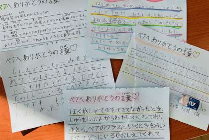 「最後の晴明祭りのペアが〇〇さんでよかったです。」「〇〇さんが楽しんでいる姿をみているだけで嬉しかったです。」「あと5回の晴明まつりを盛り上げて楽しんでね!」と、たくさんのあたたかいメッセージを書いてもらい、子ども達はとても喜んでいました!