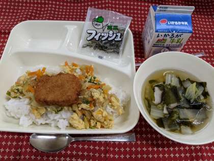 12月2日(木)のこんだては「カツ丼[個別対応献立:鶏卵]、すまし汁、ミニフィッシュ、牛乳」です。