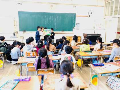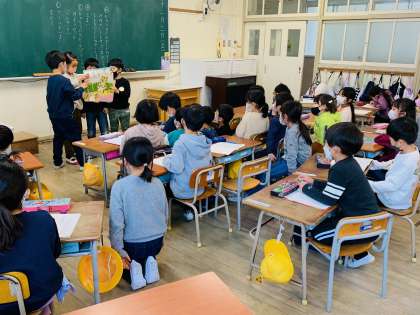 図書係が休み時間に紙芝居を読んでいる様子です。
