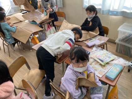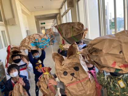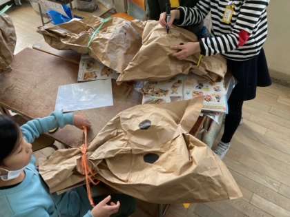 自分たちの体ほどもある大きさの紙袋を使い、工作をしました。初めにくしゅくしゅと潰して形を作ります。そこにスズランテープやペンで絵を描きます。形を生かして、魚や雪だるまなどを作っていました。