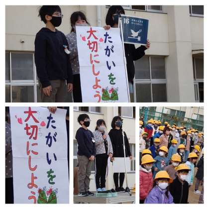 自分と違う考えをもっている人とも、同じ目標をもって一緒に頑張ってほしいです。「みんな仲良く」は難しくても、一緒に頑張ることはできます。人の嫌がることはしない、自分がされて嫌なことは人にもしないでください。今月の目標は「たがいを大切にしよう」です。人権について考えながら過ごしましょう。