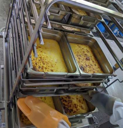 焼きプリンは、給食室で手作りしています。カラメルソースを作ってバットに敷き、卵、牛乳、クリーム、砂糖を混ぜ合わせて流し入れ、蒸し焼きにしています。卵の味がしっかり感じられる、手作りならではのプリンです。