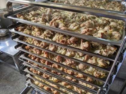鶏肉のゆず塩焼きは、鶏肉にゆず果汁と塩で下味をつけ、たまねぎと一緒に焼いています。ゆずの風味がよく効いています。