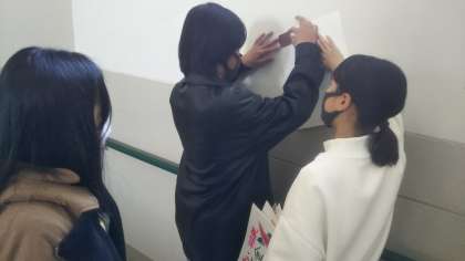 今日は、赤い羽根共同募金への協力を訴える動画を流し、各学年の廊下にポスターを貼りました。