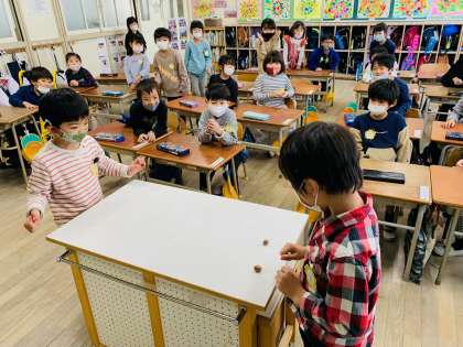 以前作ったどんぐりごまを使って、友達とバトルをしました。