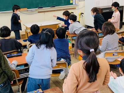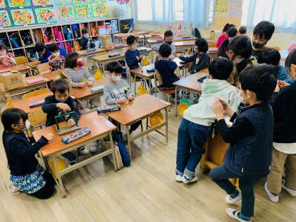 よく回った友達のこまを観察し、持ち手の長さを考えたり、どんぐりの形をよく見て選んだりしながら、もう一度よく回るこま作りに挑戦しました。