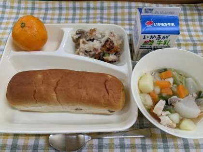 12月15日(水)のこんだては、「鶏肉とじゃがいものスープ煮、きのこのドリア、みかん、おさつパン、牛乳」です。