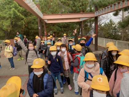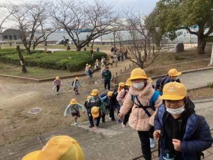 お弁当の後は日本一低い山と言われる天保山に、登山です。山頂では「すぐ着いた!」「ひくい!」と言っていました。