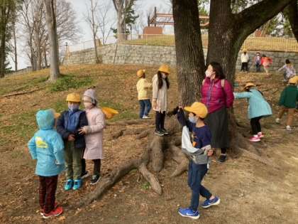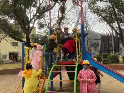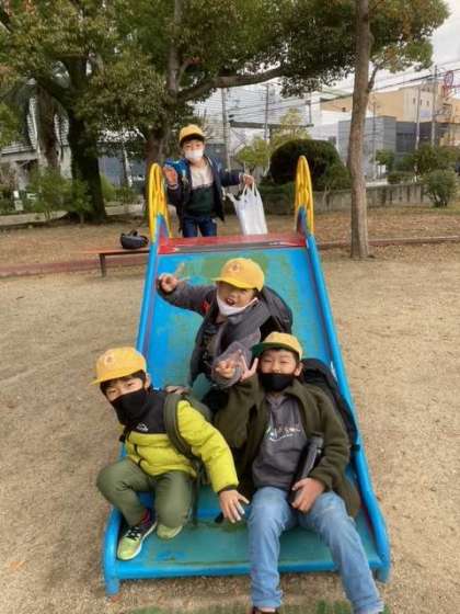 少し公園で遊びました。通り雨が降りましたが、道中では止み、順調です。このまま学校に帰ります。