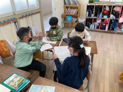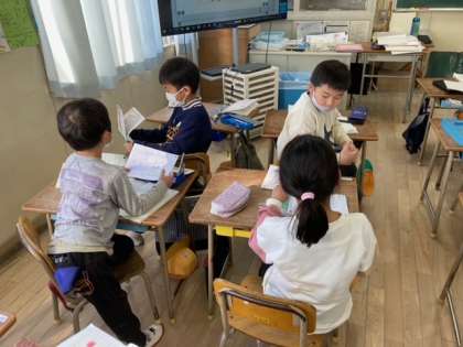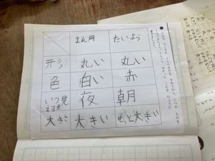 2つのものをくらべて、同じところと、違うところを見つけました。「クマとシロクマ」「ランドセルとリュックサック」「月と太陽」などそれぞれで見つけました。班で発表すると、いろいろな見方ができました。