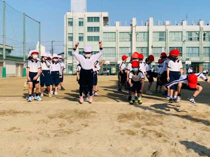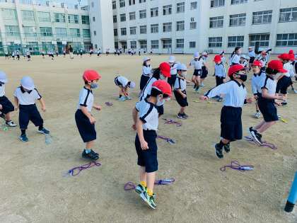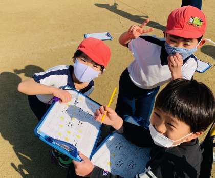 自分のとびなわを地面に置いて、踏まないように左右にジャンプしたり、砂場で立ち幅跳びをしたり、チャレンジカードを見ながら縄跳びに取り組んだり…。