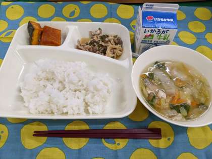 12月21日(火)のこんだては、「豚肉干しずいきのみそ煮、うすくず汁、焼きかぼちゃの甘みつかけ、ごはん、牛乳」です。