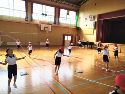 縄跳びカードを活用して、ポップコーンの曲に合わせた跳び方にチャレンジしています。