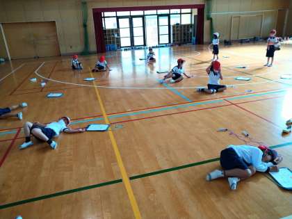 がんばって跳んだ後、床に倒れこむ児童もいました。