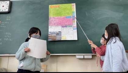 町たんけんのことを新聞にまとめ、発表しました。大きな声で役割に分かれて発表していました。感想では「町たんけんで色々なことを知れた」「上手く発表ができ、他の班の発表も聞けた」という声がありました。町たんけんを通じて、町のことだけでなく、グループワークや発表など様々なことを学べました。