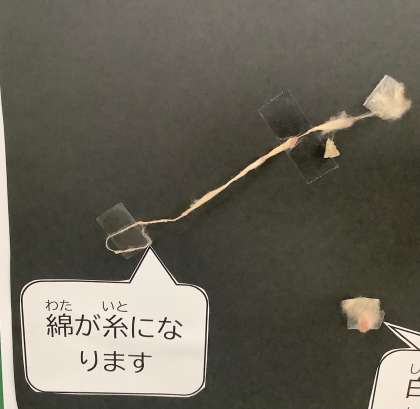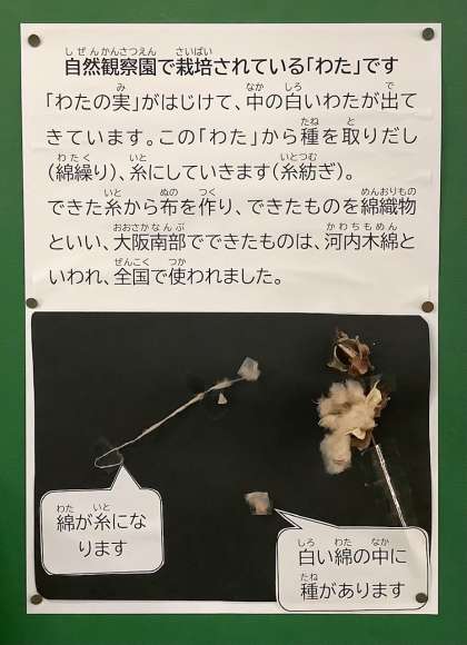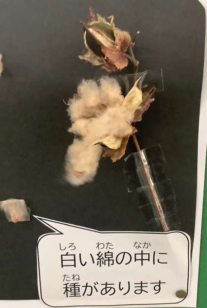 職員室前の掲示板に、地域園芸クラブの方から子どもたちにぜひ見てほしいとの思いで「わたの実」を展示していただいています。