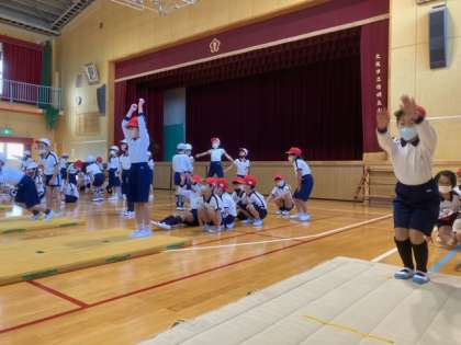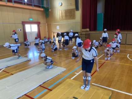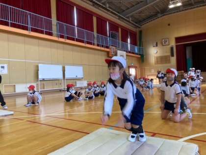 立ち幅跳びの記録を測りました。1学期に行った時から、大きく記録が伸びていました。大きくうでをふり、体を動かし温めていました。